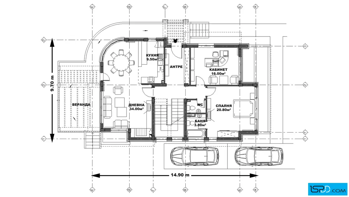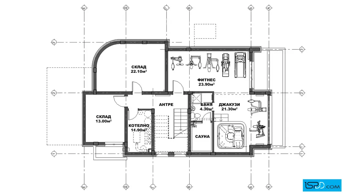 Този проект на луксозна еднофамилна къща е с модерна визия, която проличава в умелото преплитане на форми и обеми. Фасадното оформление използва съвременни материали като обработени варовикови плочи и композитни панели. Чарът на къщата е в комбинацията от овални форми, хоризонтално членение и мощни изкачащи от плоскостта на фасадата обеми. Сградата е с два надземни етажа и едно полу-подземно ниво. В сутерена са проектирани помещение за фитнес със сауна и баня, котелно и два склада. Благодарение на умелото терасиране на терена и на големите витрини, фитнесът е светъл и приветлив. В него е предвиден кът за тангенторна вана. На приземния етаж са проектирани входно фоайе, просторна дневна с кът за камина, трапезария, кухня, спалня с баня, кабинет и тоалетна. Входът на къщата и верандата към двора са покрити с дървени перголи. На втория етаж са проектирани четири големи спални и четири бани. На покривната тераса е развита градина и кът за отдих. Площното остъкляване на помещенията заедно със стъкленият ефирен парапет допринасят за модерния вид на сградата. В допълнение дневната светлина се оползотворява максимално.