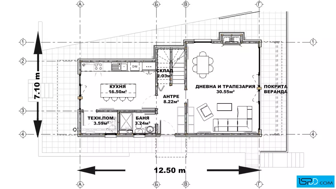 Покритата веранда е естествено продължение на дневната, предлагаща убежище сред зеленина и гледки към долината. Каменните детайли при основата и дървените елементи по фасадата придават стабилност и автентичност, характерни за планинските къщи.